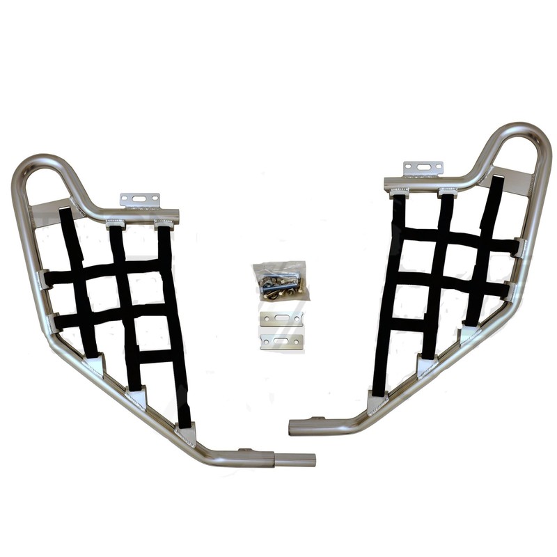 This is an Alba Racing standard nerf bar set for the Honda 700XX for the years 2008-2009. Comes in set of 2, left and right. Made of aluminum, these nerf bars are polished and anodized for a long lasting finish. Includes all hardware necessary for installation and your choice of net colors. Comes in both black and silver frame, see other listings.