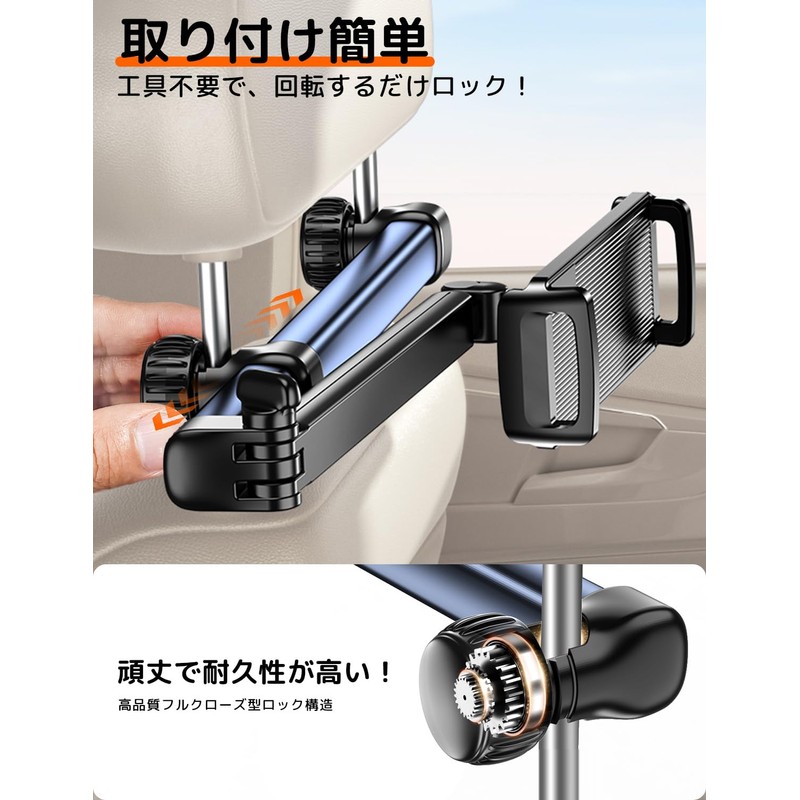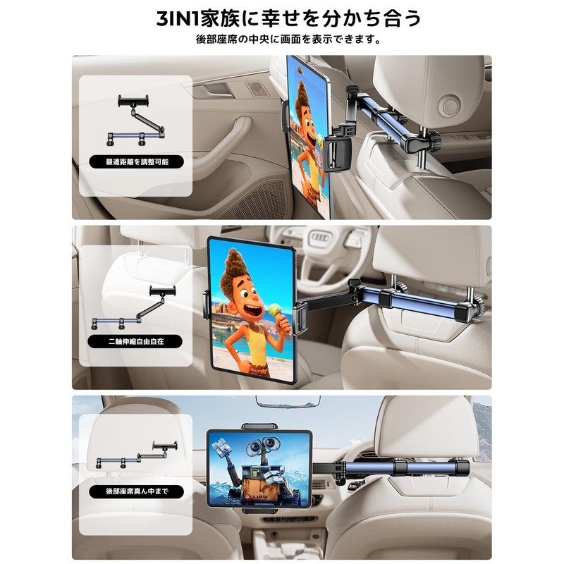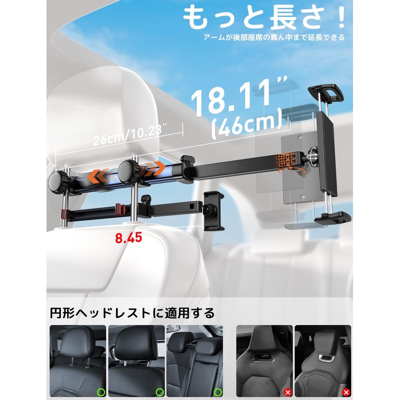 - [Industry's longest biaxis telescoping arm, to the middle of the back seat; Share happiness]: Introducing the 2025 improved tablet holder. We have improved the product on the market and developed the longest car tablet holder in the industry (16.5 cm) in the arm. Biaxis telescopic arm design, no distance limit, you can freely adjust the best distance from your eyes. Even after long drives, kids can play without noise. Eye-friendly design can protect children's eyesight. Furthermore, it has a longer arm so you can extend it to the middle of the back seat, so you can enjoy the screen together even if you are sitting multiple people. Recommended if you have two or more children. Reduces the fact that your tablet is seen. The back seat becomes a home theater in seconds, freeing up your hands and long trips will not be boring, kids and other backseat passengers can enjoy themselves during long distance driving, allowing drivers to drive more concentration. Make driving atmosphere more fun!
