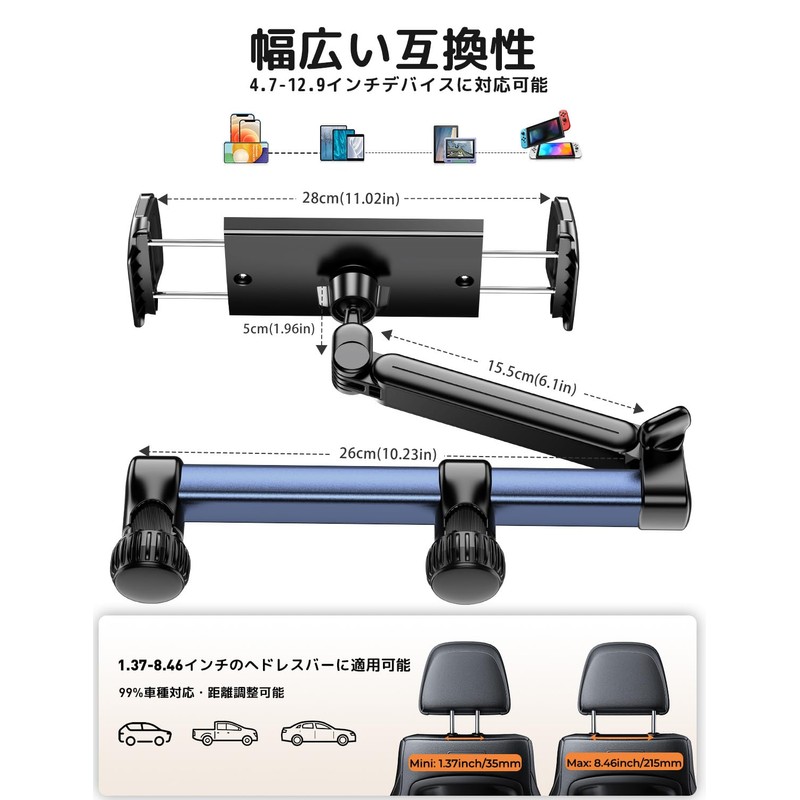 - (Advanced Clamp, 4.7-11 inch Compatible with Many Models) The grip part of many car holders on the market uses plastic springs, and there is a disadvantage that it is prone to break or deterioration due to long-term use and repeated opening. To solve these problems at the root, we have developed our own metal spring clamps that are durable and reliable. The metal spring provides strong holding power and long service life and holds your tablet or smartphone firmly in place. You can use it safely even in the car with frequent vibrations or sways. It also has less spring tension after repeated use and maintains a stable grip for longer. And, unlike other clamps, all devices with a larger size of about 4.7 - 12.9 inches can be used with this in-car tablet holder and will also fit smartphones, tablets, Switch, Kindle, Nintendo and more. Can be used even with the case on. Enjoy music, movies, karaoke and more with your tablet