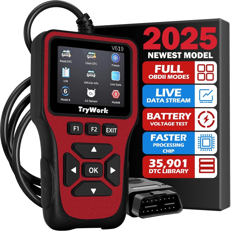 TryWork OBD2 Scanner Diagnostic Tool, Check Engine Code Reader with 35901 DTC Lookup, Mode 6 & 8, I/M Readiness for All OBDII Cars Since 1996 (Red)
