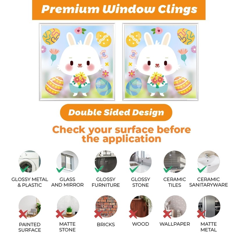 - 🐥 Suitable Surface 🐥 Our happy easter stickers decorations are perfect for embellishing windows, mirrors, and glass doors. Prior to applying the clings, ensure that the surfaces are clean and free from dust or grease. Please note that these Easter window stickers are not suitable for textured surfaces or to be used as wall decals.