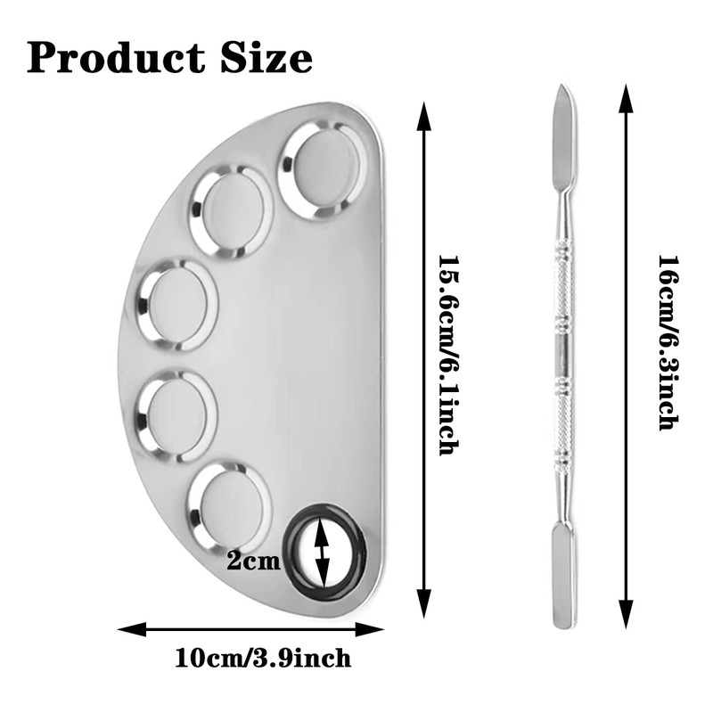 - Great design: palette with a diameter of 2 cm rubberised thumb hole for easy holding. Two different ends of the spatula, multiple use for removing creams as well as for mixing cosmetics.