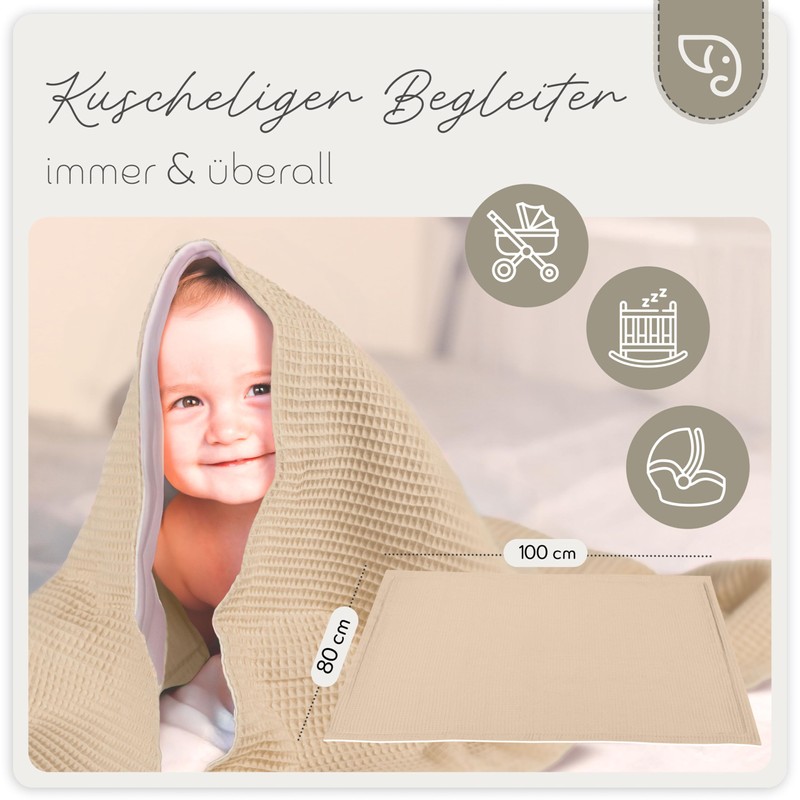 - Perfect size and stylish colours – with 80 x 100 cm, the blanket offers versatile use as a pram, crawling or duvet. Available in timeless colours such as beige, grey, blue and pink, it blends harmoniously into any modern baby equipment.