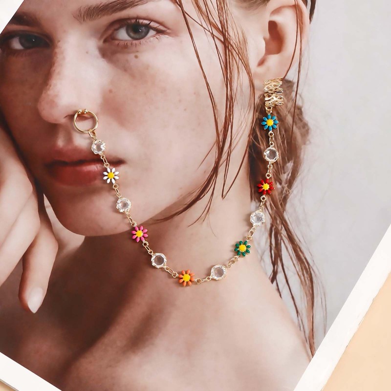 - Gold chain flower nose rings earrings.Item details:Handmade item.Size:As pictured.Color:Gold.Materials:Ordinary alloy.Location:Nose and Ear.Style:Boho/Vintage.There are slight errors due to manual measurement.Due to the shooting environment, there may be slight color differences..