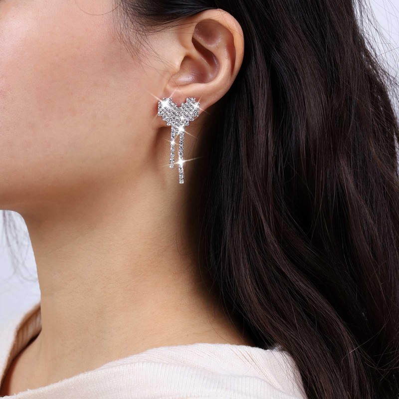 • Long heart earrings with rhinestones.Product details:Handmade.Dimensions:as shown in the picture.Color:Silver.Material: High quality alloy.Location:Ear.Style:Boho/Vintage.There are slight errors due to manual measurement.Due to the shooting environment, there may be slight color differences..