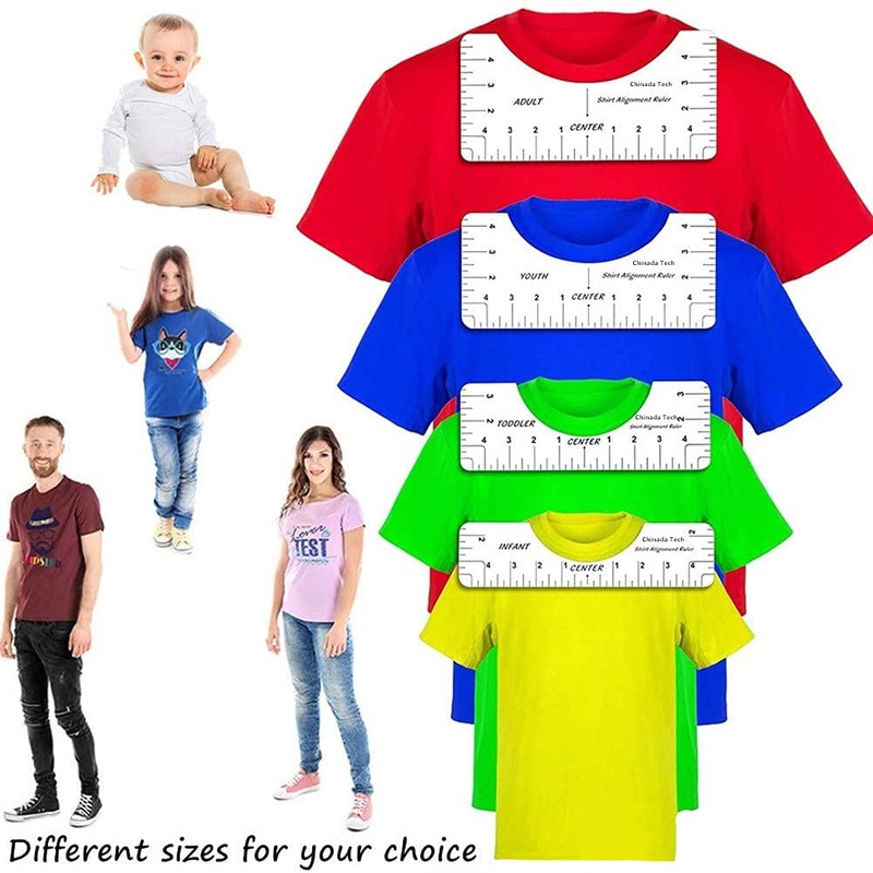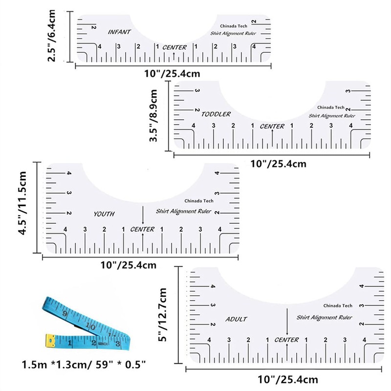 Tshirt Ruler Guide for HTV Vinyl Heat Transfer Vinyl and Sublimation, 4Pcs T-Shirt Alignment Tool with 1Pcs Measuring Tape, Adult Youth Toddler Infant Shirt Centering Ruler Set (White)