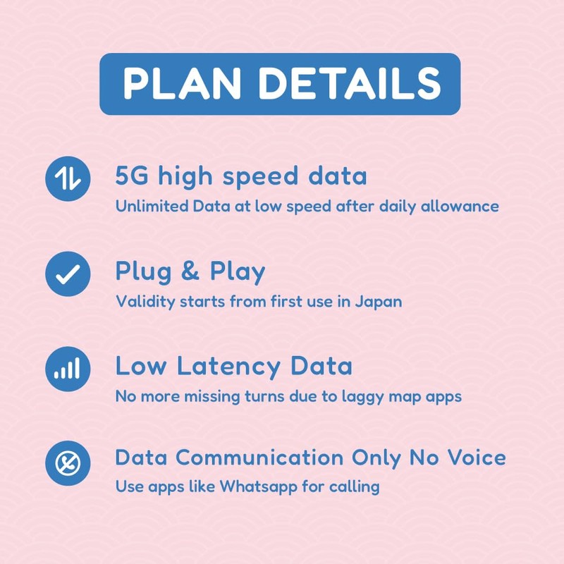 - 🛜 Japan SIM Card with unlimited 5G/4G/LTE Data. After daily allowance of 1GB speed drops to 384kbps and resets next day. Hotspot / Tethering / Internet Sharing allowed