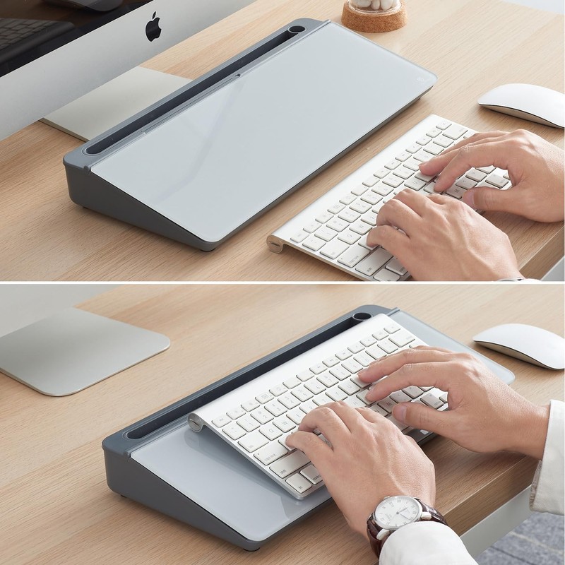 - PERFECT DESIGN: Maximize your work area. The desktop whiteboard is designed to sit perfectly between a keyboard and monitor and is slope angled for comfortable reading and writing, or typing when you are using it as a keyboard stand.