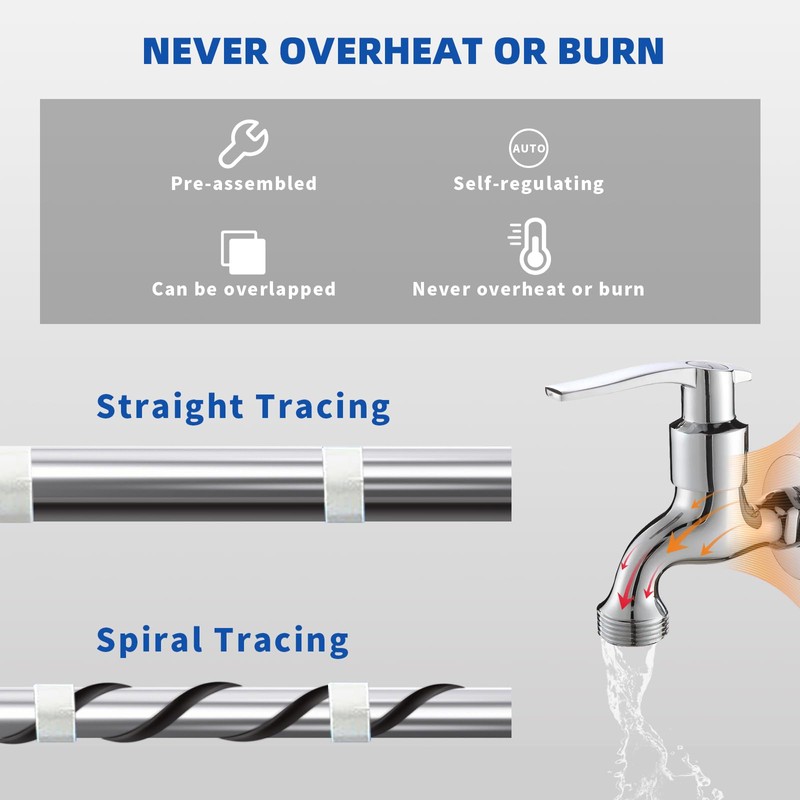 - FOR BOTH PLASTIC AND METAL PIPES: The heat trace for pipes protects commercial and residential plastic or metal water supply pipes from freezing in cold winter (Including RV, inlet pipe, drain pipe, sewer, palm tree frost protection, etc).