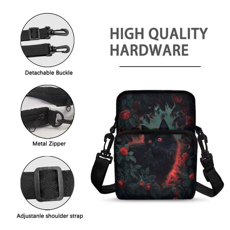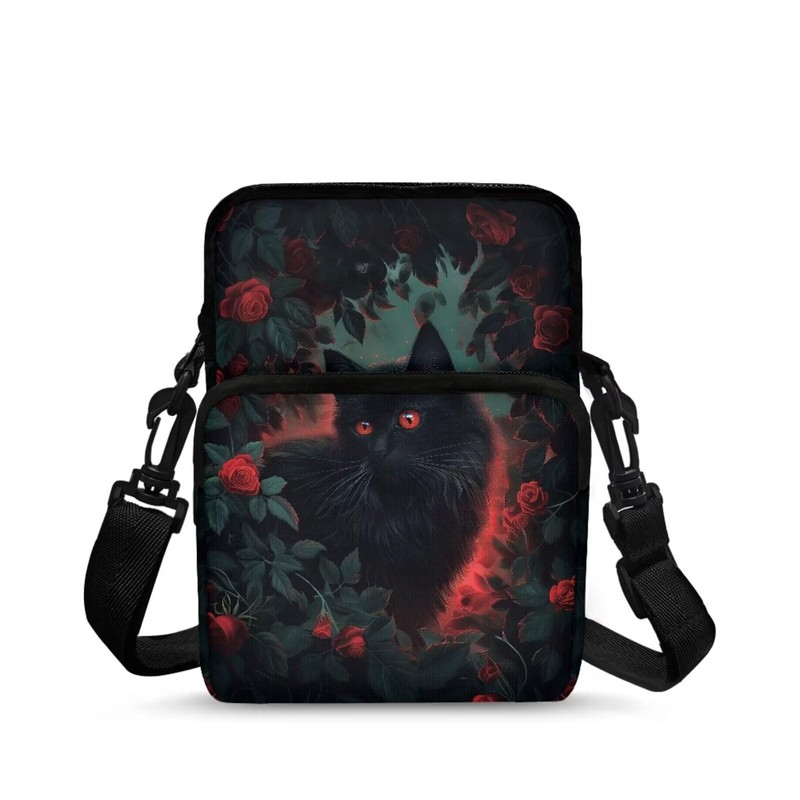 TSOVTHRID Black Cat Red Rose Green Leaf Print Men's Cross Body Bag, 2 Layer Small Messenger Bag Waist Fanny Pack Phone Pouch Handbag for Kid Girl Boy Teen College