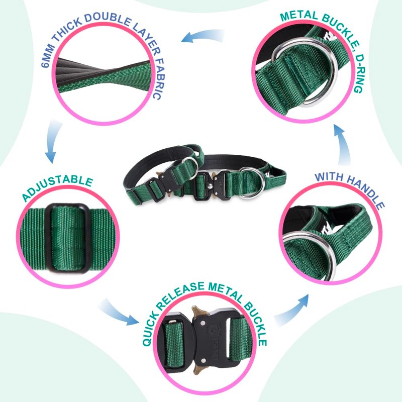 • Heavy duty dog collars. The metal dog collar with quick-release metal buckle and slider is easy to adjust and convenient to put on and take off. The quick-release metal clasp features a smooth locking mechanism. Equipped with a large D-ring for quick and easy leash attachment. Please follow the size chart to measure your dog carefully before making the purchase to ensure the collar fits your dog well.