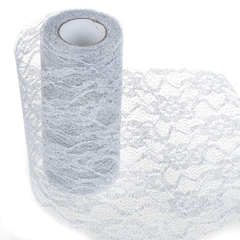 TsunNee Glitter Lace Roll Table Runner, Chair Sash, Tutu Material, Lace Bow for Wedding Chair Table Decoration, 15 cm x 9.1 m, Silver