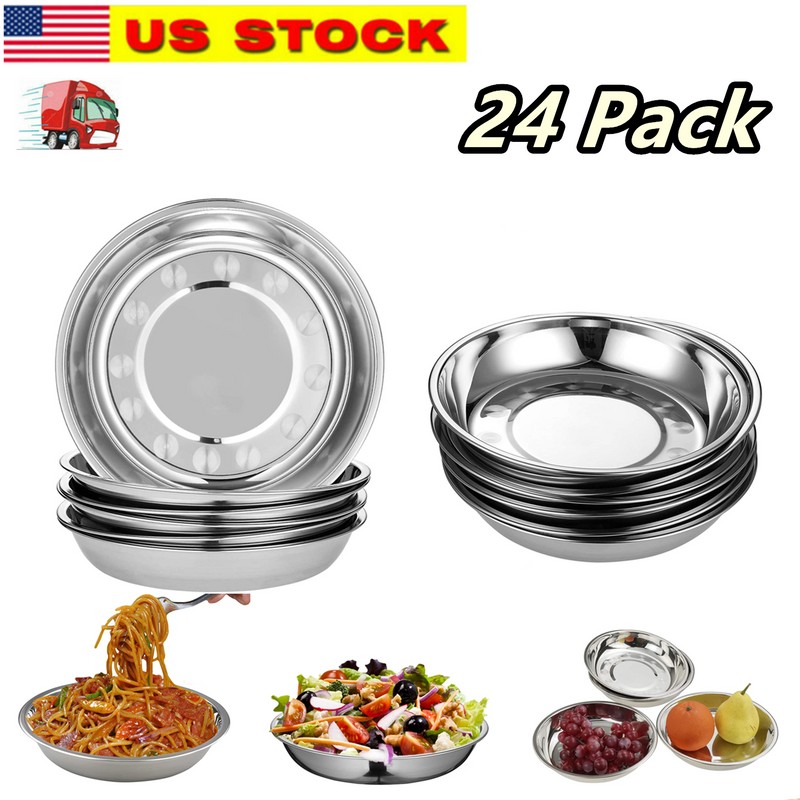 Tsyware 24x Unbreakable Stainless Steel Round Plates 7" Dinner Plate Dish Camping Picnic