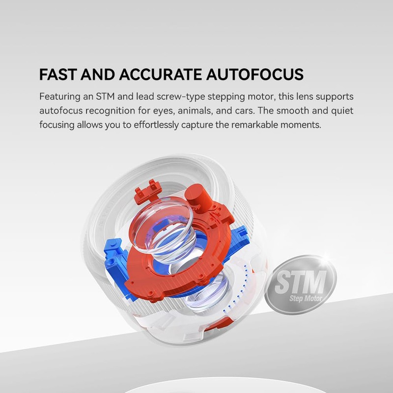 - Fast and Accurate Autofocus: Featuring an STM and lead screw-type stepping motor, this lens supports autofous recognition for eyes, animals, and cars. The smooth and quiet focusing allows you to effortlessly capture the remarkable moments.