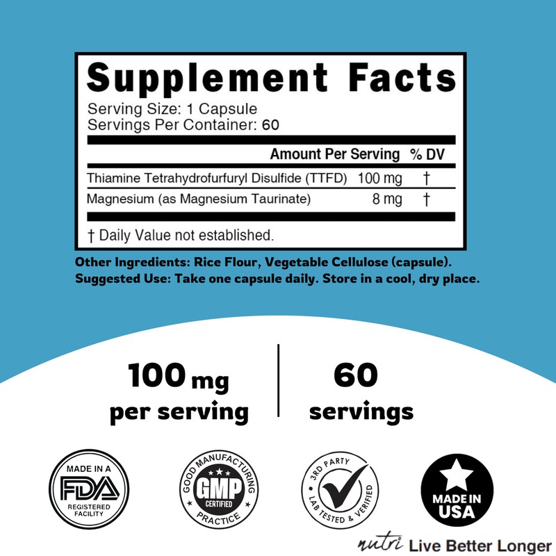 Nature's Fusions TTFD Thiamine B1 Supplement - 100mg 60 Servings - with 8mg Magnesium - No Toxic Fillers - TTFD Thiamine Tetrahydrofurfuryl Disulfide - Third Party Lab Tested - Nutri Supplements