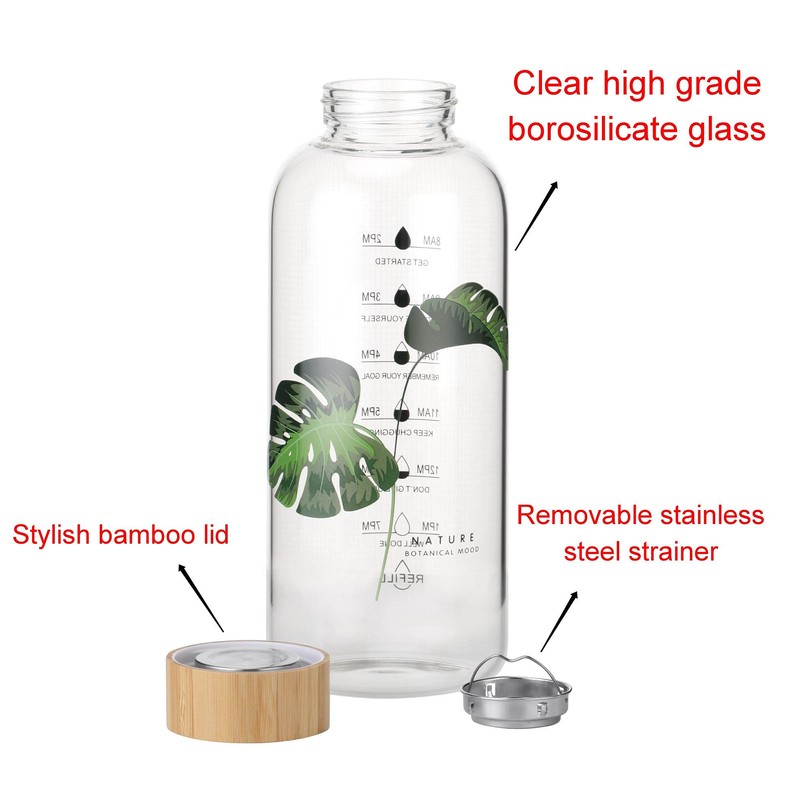 - Cute Water Bottle Design: Clear glass bottle, stylish bamboo lid, pretty printing. We believe that drinking from perfectly designed water bottles will also enhance your daily joys.