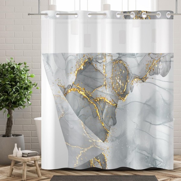 Ttincceer Hookless Shower Curtain with Snap in Fabric Liner Grey Gold Marble No Hooks Shower Curtains Waterproof Luxury Double Layer Bathroom Curtain with See Through Top Window 180 x 218 cm