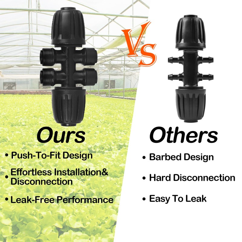 • Easy Installation: The push-to-connect design allows for quick and easy installation without the need for tools or soaking in hot water. Simply push the drip tubing for a tight and leak-free connections in seconds, eliminate the hassle of traditional 1/2" to 1/4" barbed tee connections. With the one-touch pull-out design, you can easily detach the connectors to adapt the layout of your drip irrigation system effortlessly