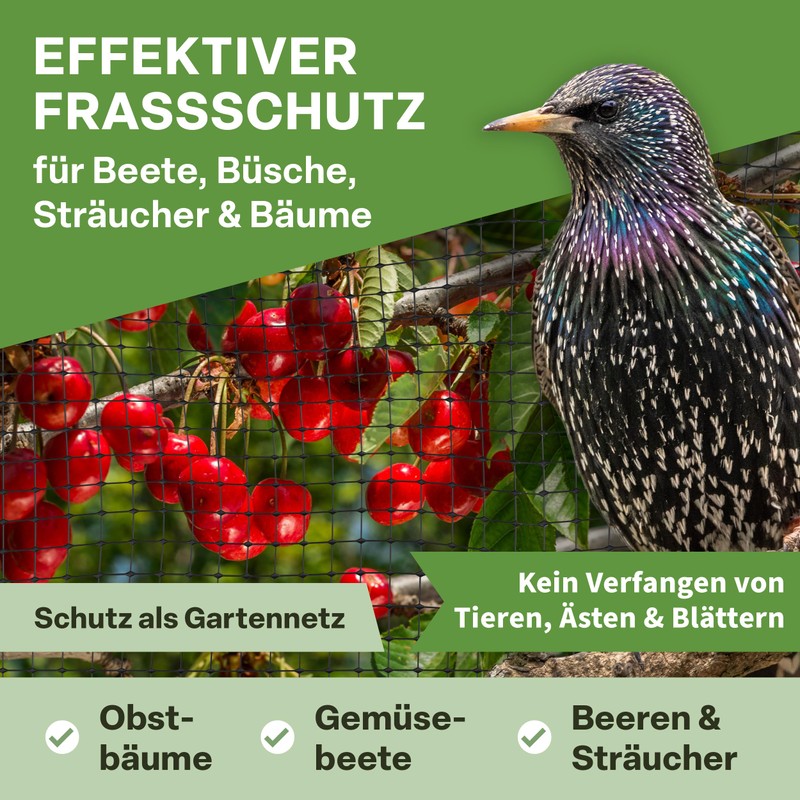 With a mesh size of 12 x 12 mm, the net offers reliable protection without letting animals or leaves through. Fruit trees, cherry trees, strawberries and flowers remain untouched - the net effectively prevents penetration without disturbing plants in their growth.