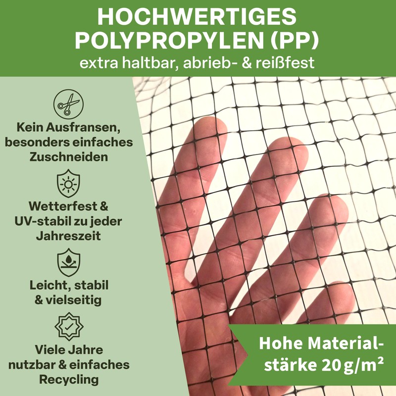 Made from durable polypropylene, the net is particularly tear-resistant, dimensionally stable and weather-resistant. The high-quality material thickness of 20 g/m² ensures a long service life - ideal for permanent use in the garden, on the balcony or in the planter on the terrace.