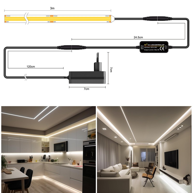 • COB LED strip 3M: compared to conventional LED strips, the TTWAY COB LED strip has high density LEDs (480 LEDs/m), a beam angle of 180°, CRI 90+ and low energy consumption (24 W). It is more uniform and point-less