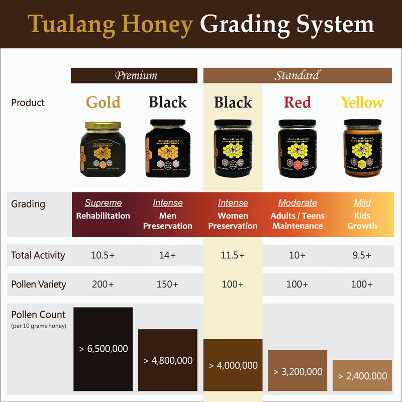 - TUALANG GRADING. Premium Honey is rated in 3 major elements: Total Activity, Pollen Varieties and Pollen Count. Health Harvest Tualang Honey is available in 4 gradings satisfy consumers with different therapy and maintenance needs: GOLD (Adjuvant Therapy & Rehabilitation), BLACK (Health Preservation), RED (Health Maintenance) and YELLOW (Kids Growth). Refer to product pictures for the classification chart.
