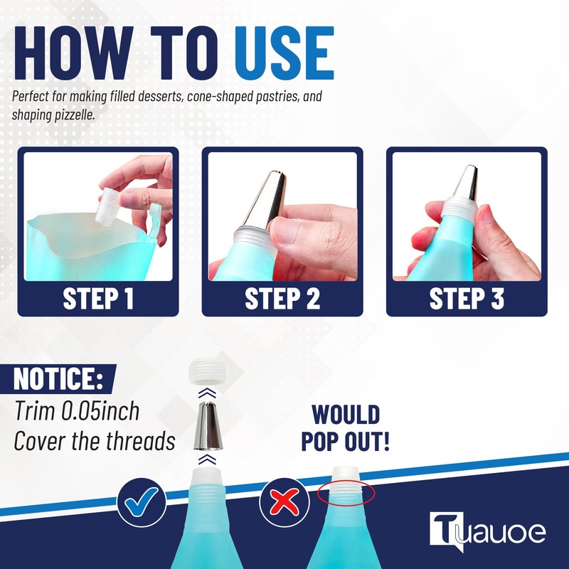 - Package include: 16 x Cone Shaped Mold, 12 x Tubular Shaped Mold, 1 x Puff Nozzle Tip, 3 x Piping Tip, 1 x Coupler, 1 x Piping Bag, 1 x Cleaning Brush. (Please dry thoroughly after washing)