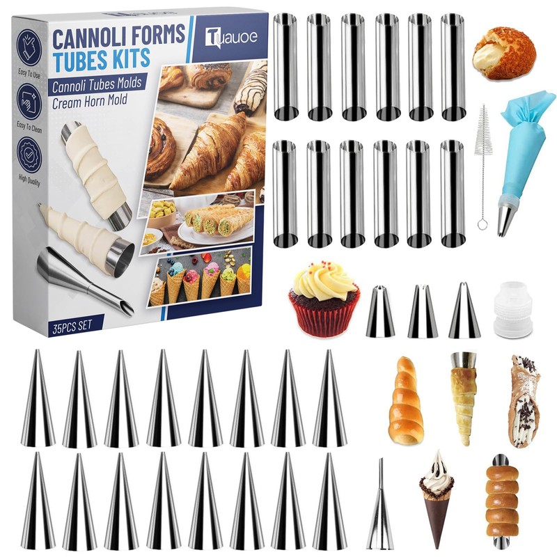 Tuauoe Cream Horn Molds for Baking, 35pcs Cannoli Tubes Molds, Non-stick Stainless Steel 16pcs Cone Shaped and 12pcs Tubular Shaped Cannoli Forms for Danish Pastry Lady Lock Form Cream Roll Croissant