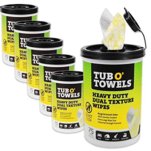 Tub O’ Towels TW75 Heavy-Duty 10" x 12" Size Multi-Surface Cleaning Wipes, Dual Texture, 75 Count Per Canister, 6 Pack