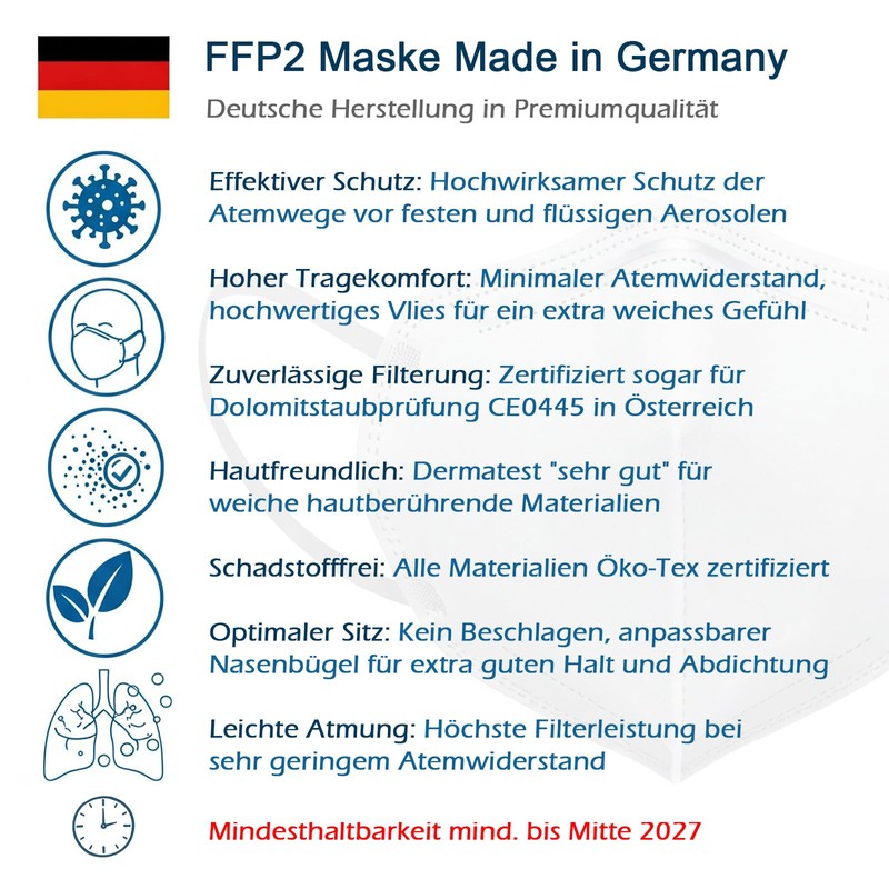 Premium quality – 100% made in Germany: the FFP2 mask is completely made in Germany. High-quality materials (skin-friendly and allergen-free) and high-technology manufacturing guarantee the best German quality.