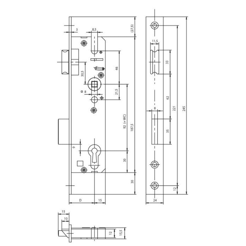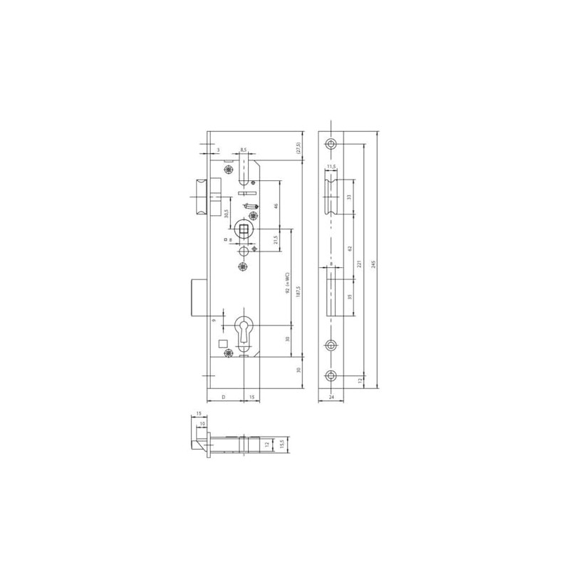 Spacing: 92 mm,, nut: 5/16 (8 mm) strike plate 24 mm mm Width, PZ, quick release