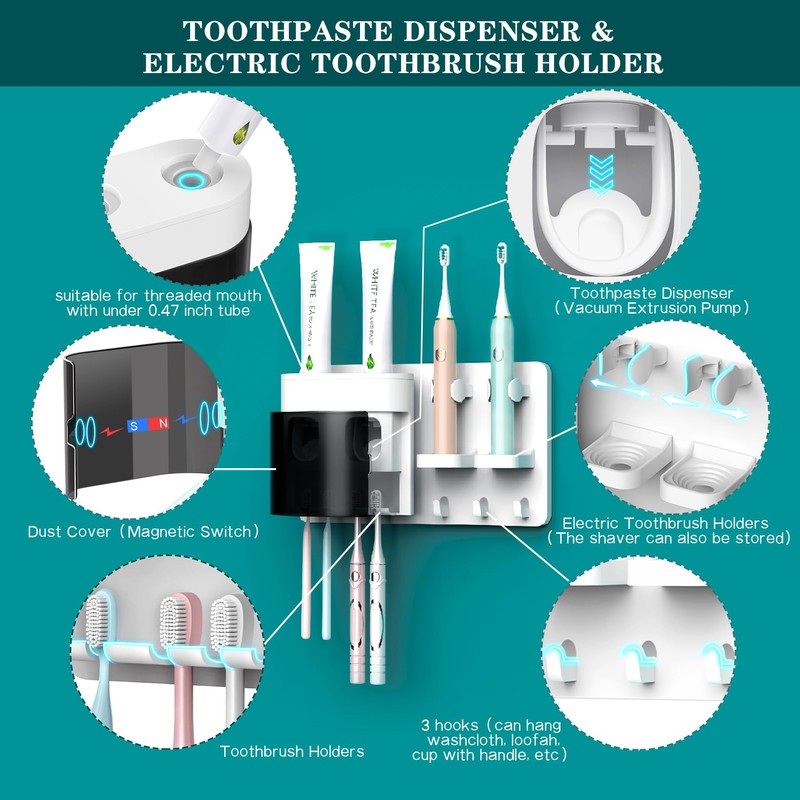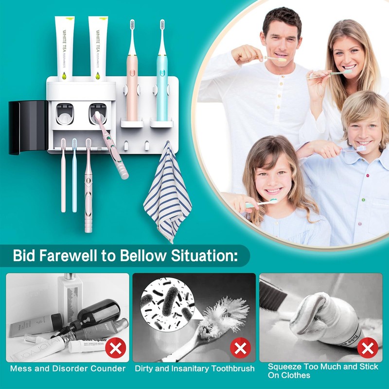 - 【Food Grade Material】 The toothpaste dispenser and toothbrush holder is made of PC+ABS and high quality food-grade polymer material. It's BPA free, Safe and durable. Containing 2 automatic toothpaste dispensers, 3 Hooks, 2 Electric toothbrush holders and 4 toothbrush holders, it suitable for kids and you in your whole family.