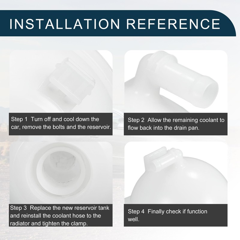 - Installation. 1. Turn off and cool down the car, remove the bolts and the reservoir; 2. Allow the remaining coolant to flow back into the drain pan; 3. Replace the new reservoir tank and reinstall the coolant hose to the radiator and tighten the clamp; 4. Finally check if function well.