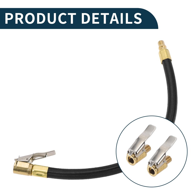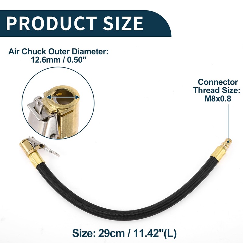 • Info:Color: Black, Gold Tone, Silver Tone, Material: Nylon, Metal, Size: 29cm / 11.42"(L), Connector Thread Size: M8x0.8, Air Chuck Outer Diameter: 12.6mm / 0.50", Type of Tire Connection: Quick-inflation Clip Connector, Type of Inflator Adapter: 0.305inx32TPI