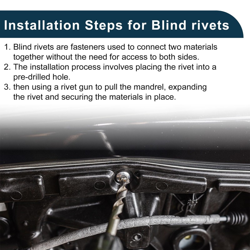 - Easy / Professional Installation:Installation Steps for Blind rivets: 1. Blind rivets are fasteners used to connect two materials together without the need for access to both sides. 2. The installation process involves placing the rivet into a pre-drilled hole, 3. then using a rivet gun to pull the mandrel, expanding the rivet and securing the materials in place.