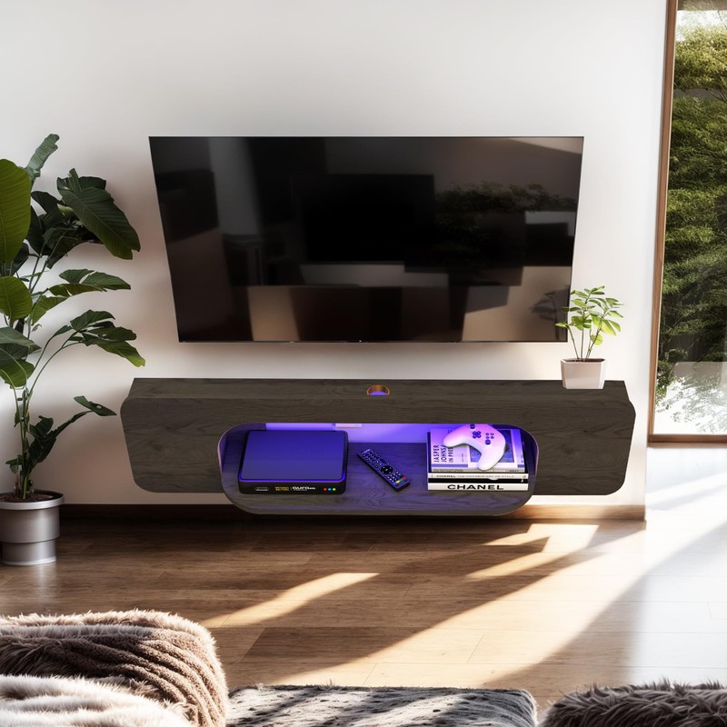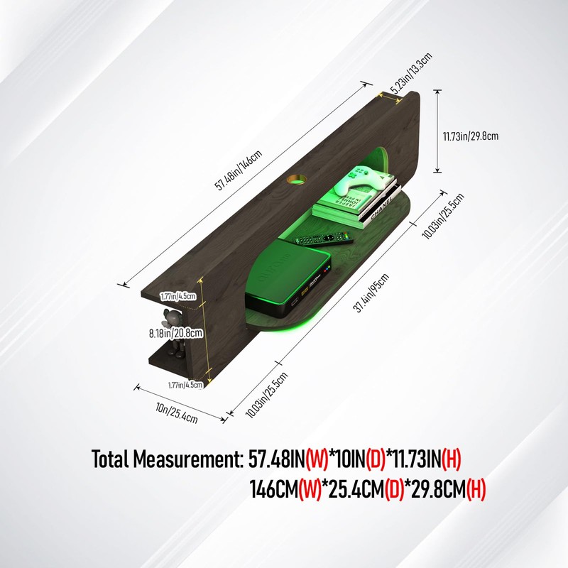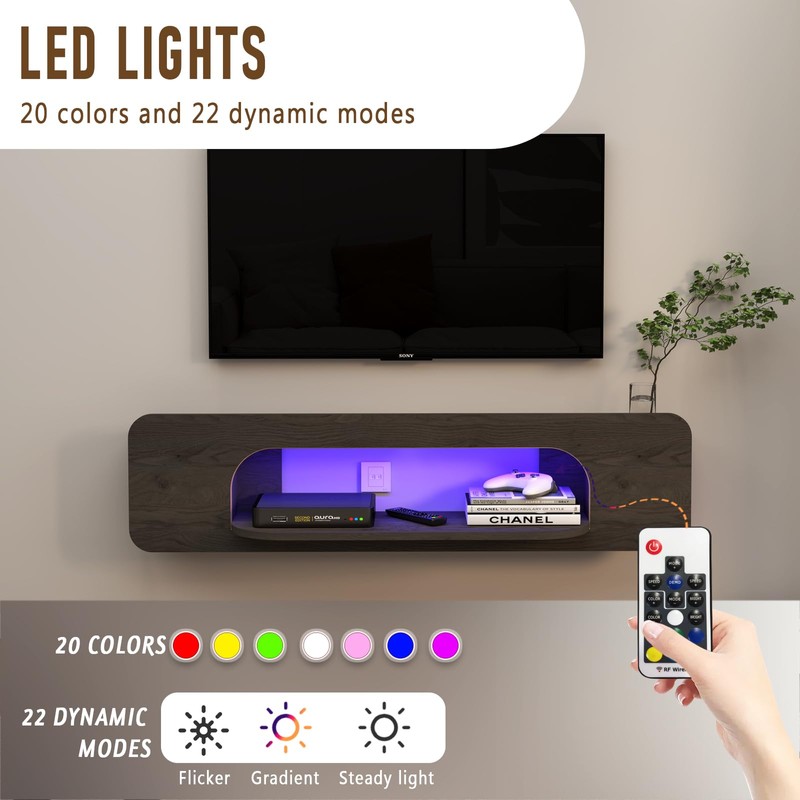 - [Strip LED Lights] The floating TV stand features 20 colors and 22 dynamic modes (flash, fade, smooth). This floating TV shelf with LED lights provides elegant lighting in warm and cool. The wall mounted TV stand will bring better entertainment experience for your family to watch movies and play games.