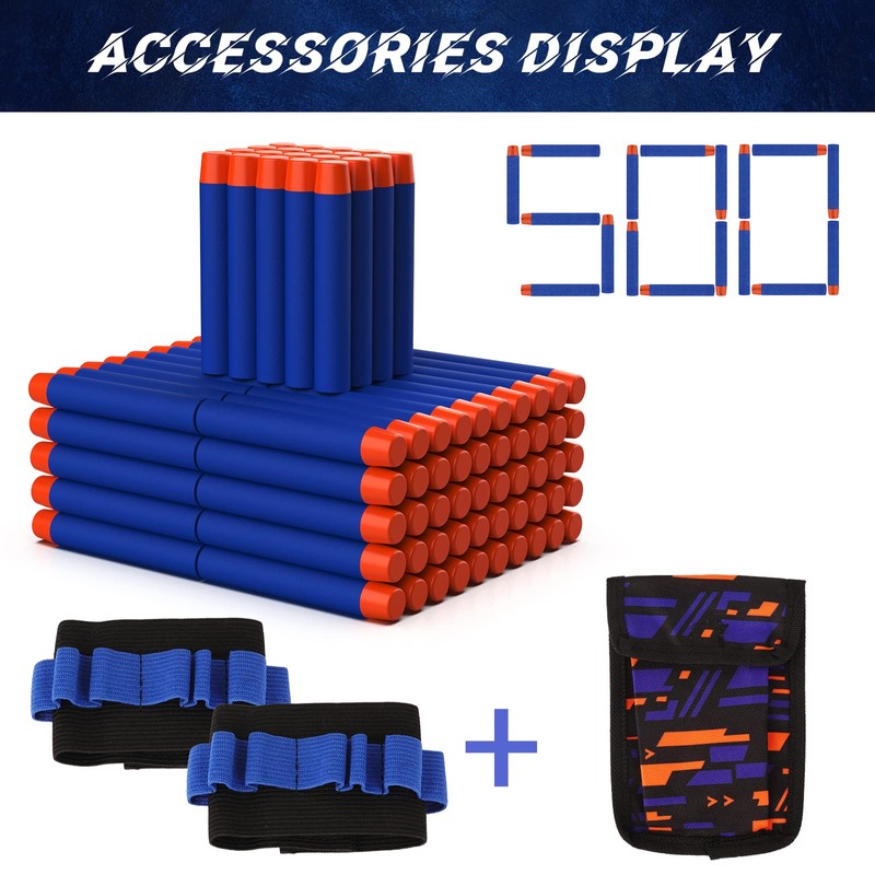 - Package Included: The refill pack contains 500 PCS non-toxic and soft EVA foam dartsstorage bag and wristbands.Tudaymol Nerf Bullets 500-Pack is a great choice and is suitable for gifting