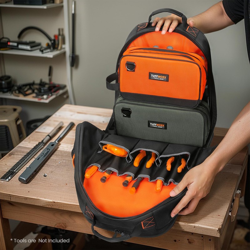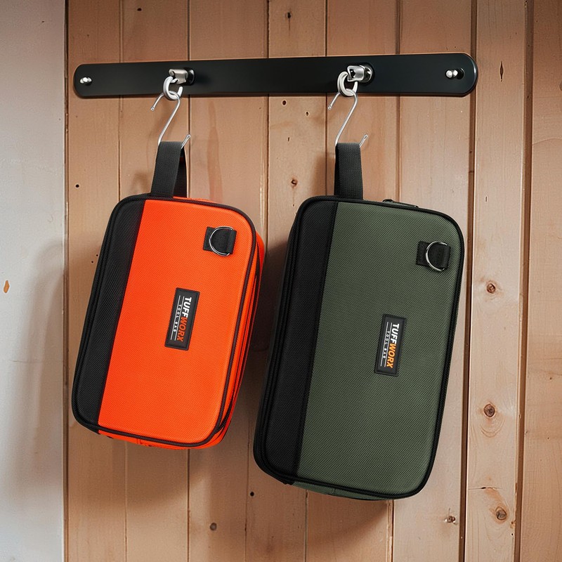 Introducing the TUFFEWORX Tool Bag duo, a versatile storage solution for organizing your tools and accessories. This 2-pack set features durable bags in sleek gray and vibrant orange, each crafted with robust materials and practical design elements. The multi-compartment configuration helps keep your items organized and easily accessible, while the sturdy zippers ensure your tools stay secure. Each bag comes with a convenient carrying handle and multiple storage sections, making it perfect for both professional contractors and DIY enthusiasts. The compact size allows for easy transport and storage, while the reinforced bottom provides extra durability. Whether you're storing hand tools, small power tools, or maintenance supplies, these bags offer the perfect balance of functionality and portability. The water-resistant exterior helps protect your valuable tools, while the professional appearance keeps you looking organized on any job site.
