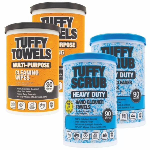 - PACK OF 4: (2) Tuffy Scrub Heavy Duty Hand Cleaner and (2) Tuffy Multi-Surface Cleaning Wipes. These extra-large 10" x 12" towels are packed with powerful cleaning agents that easily remove industrial paints, epoxy, grease, oil, tar, and more, leaving your hands clean and residue-free.