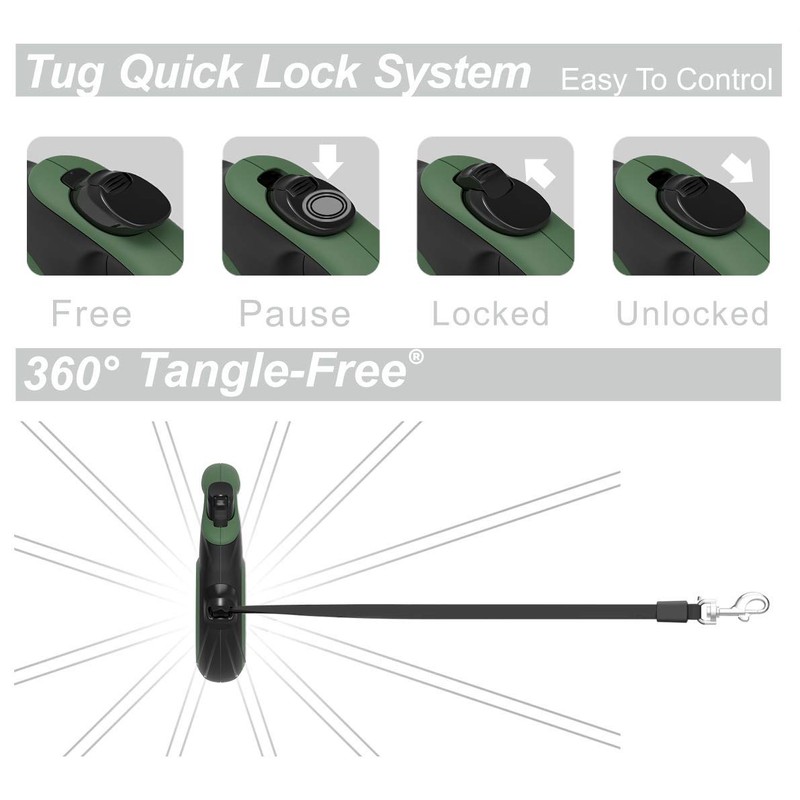 TUG TUG 360 Tangle-Free Retractable Dog Leash with Anti-Slip Handle | 16 ft Strong Nylon Tape | One-Handed Brake, Pause, Lock (Medium, Green)