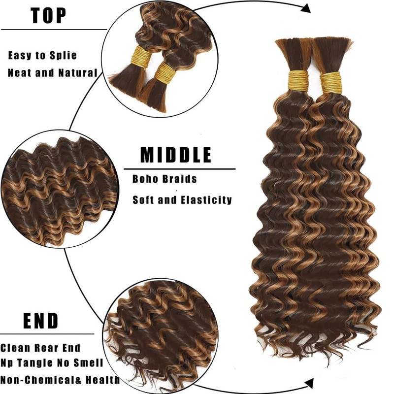 - [Boho Braids Human Hair]: Our Deep Wave bulk human hair is different from the general hair extensions,there is no weft, making it incredibly versatile for various braiding styles. Such as Boho braids, knotless Boho braids, box braids, cornrows, twists, curly loose wave hair styles,etc..