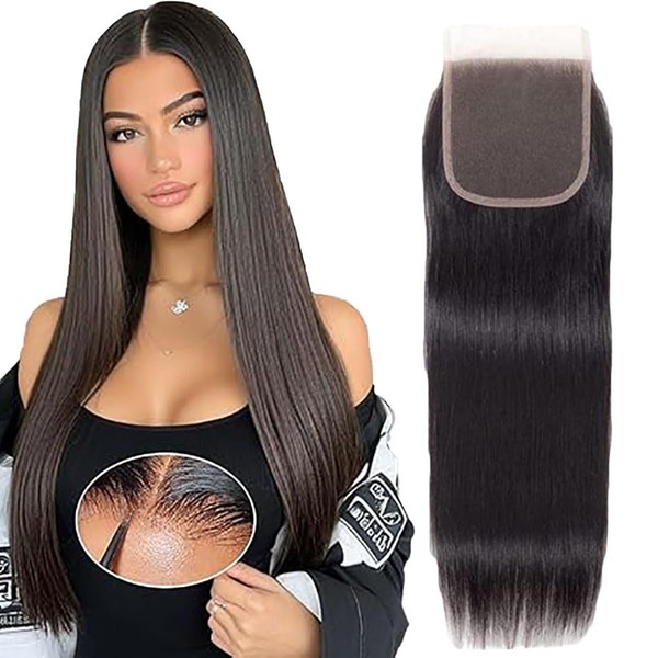 Tuheerst Lace Closure Human Hair Brazilian Virgin Remy Hair 4x4 Lace Closure Bresilienne Cheveux Humain Straight Closure Bresilienne Natural Black for Woman 30 Inches