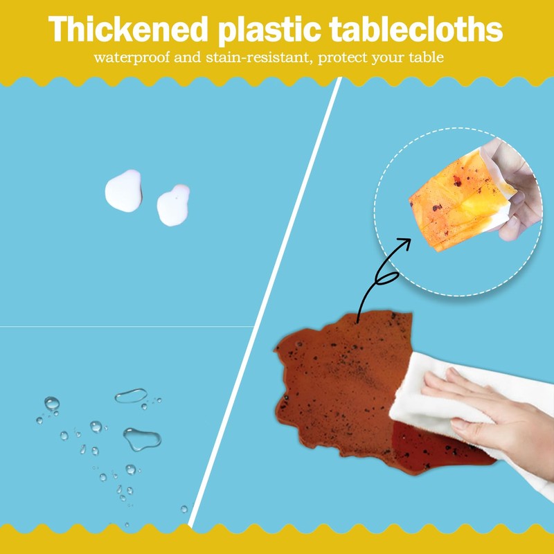 - Premium: Made of high quality, high density plastic material. Thickened plastic table cloths are waterproof and stain-resistant, effectively keeping the clean of the table. And also these plastic tablecloths are tear-resistant.