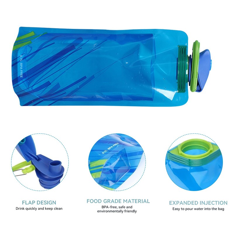 - Portable design: foldable water bag made of plastic, BPA-free and reusable. Comes with a hiking hook that allows you to hang your foldable sports water bottle on your backpack.