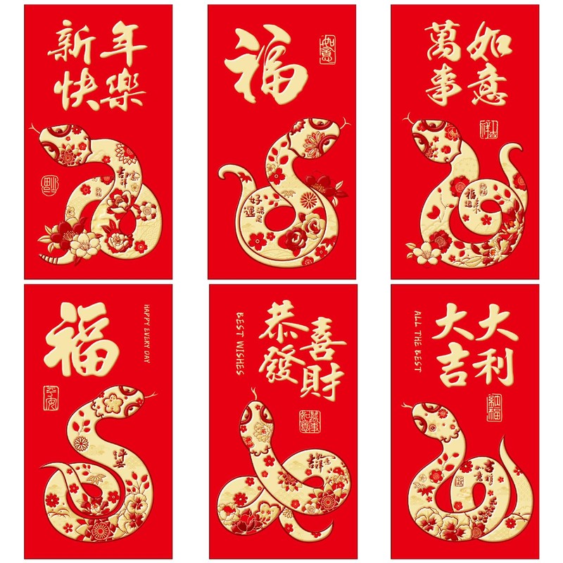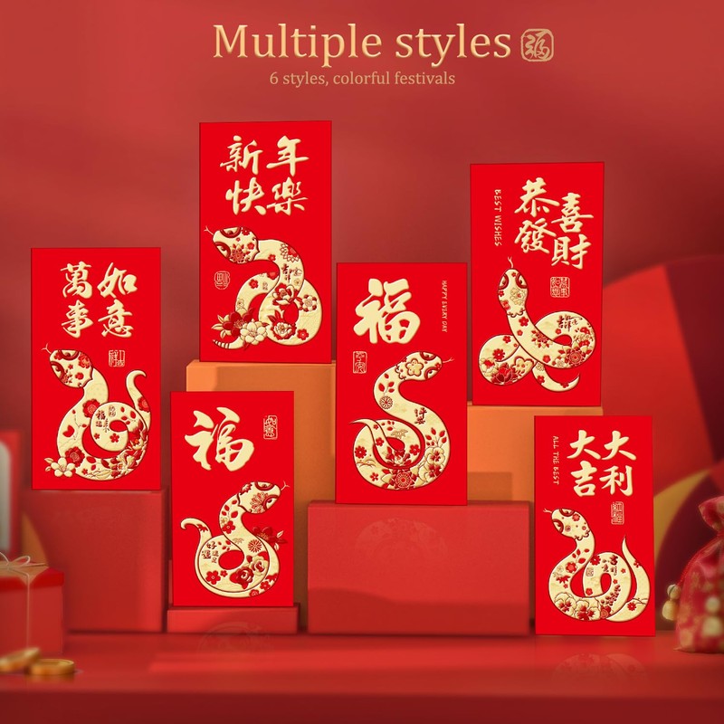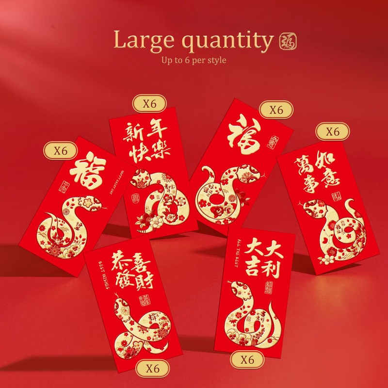 - Celebrate the Year of the Snake with Lucky Money Envelopes: These 36pcs red Chinese envelopes are the perfect way to celebrate the Chinese New Year 2025 and the Year of the Snake. Featuring snake designs, theselucky money envelopesare ideal for gifting cash, gift cards, or small tokens to family and friends, symbolizing good fortune and prosperity.