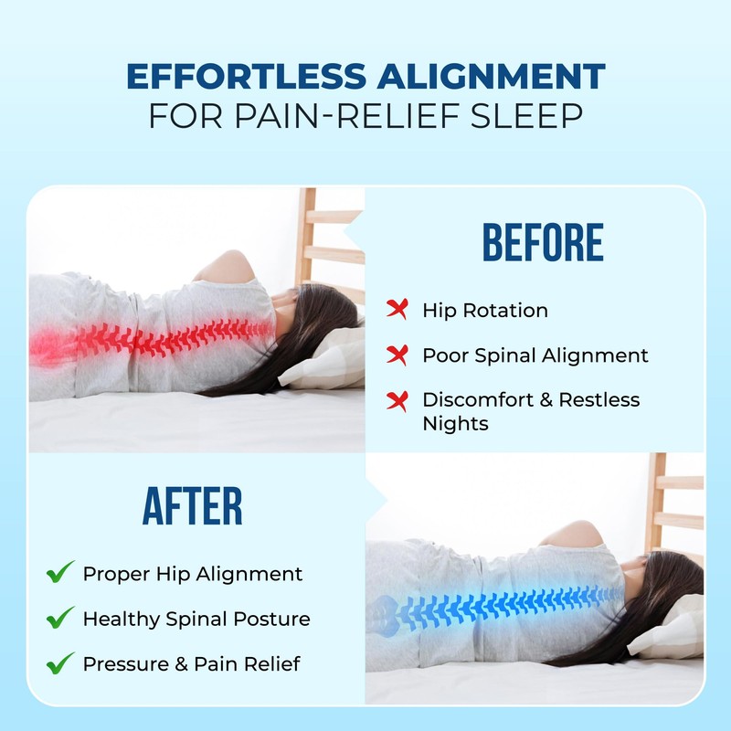 - Sciatica, Hip & Back Pain Relief: Ergonomically contoured to fit between your thighs or knees, this sciatica pain relief pillow aligns your spine, hips, and joints to ease pressure and reduce pain while side sleeping