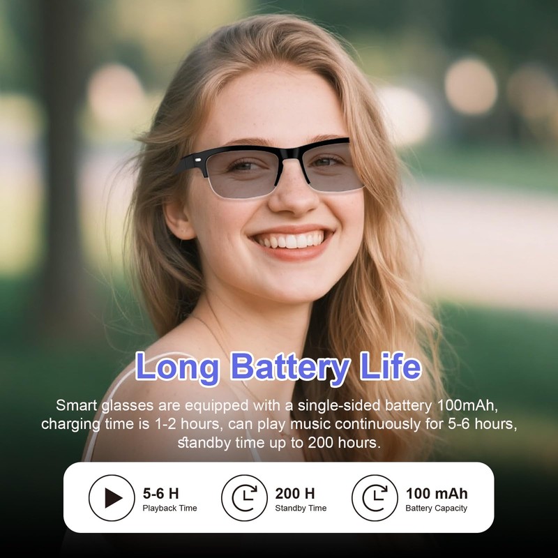 - 【Extended Battery & Bluetooth 5.4】 Smart eyewear has 6-hour playtime / 200-hour standby. Recharges fully in 1.5hrs via USB C magnetic cable, ready for long-lasting commutes or gym sessions.The smart glasses are equipped with Bluetooth 5.4 technology, which provides fast and stable connection.