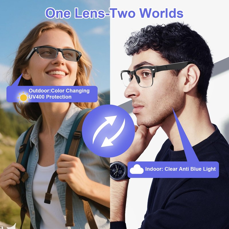 - 【Photochromic Smart Glasses & Dual Protection】 Blue Light Filtering + Polarized UV400 Lenses. Auto-adjusting lenses block harmful blue light indoors and transform into polarized sunglasses outdoors.Smart glasses for men women combines blue light filtering for work/gaming and UV protection for sports/driving - perfect for outdoor uv protection and digital eye strain relief.