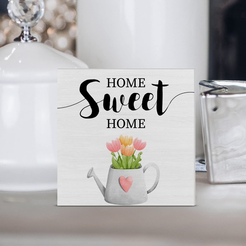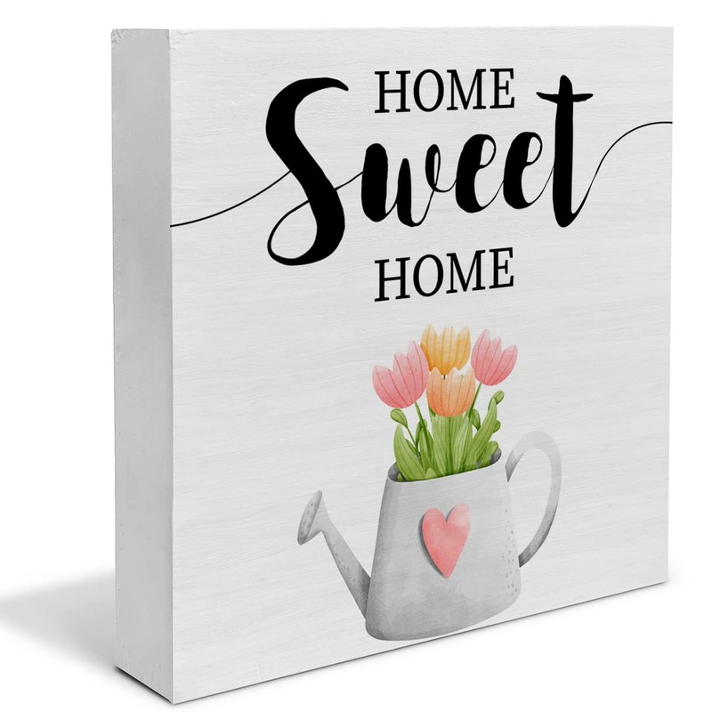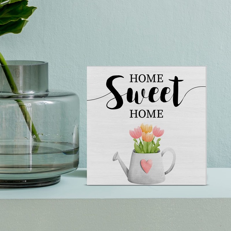 Tulip Floral Home Sweet Home Wooden Box Sign Farmhouse Spring Wood Box Sign Art Blocks Desk Sign Rustic for Shelf Tabletop Home Decor 5 X 5 Inch