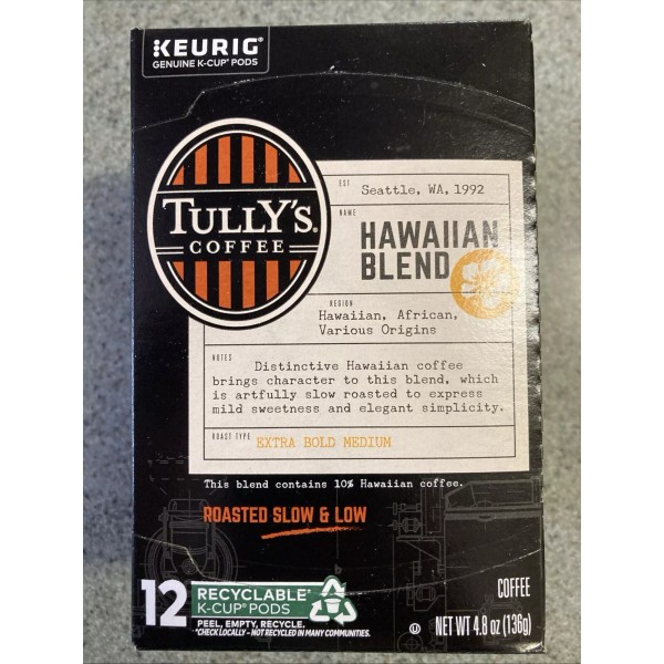 Get your hands on this amazing Tully's Coffee Pod, Hawaiian Blend - 12 K Cups that will give you a delicious and flavorful coffee experience. Best by 5/26. Ships free